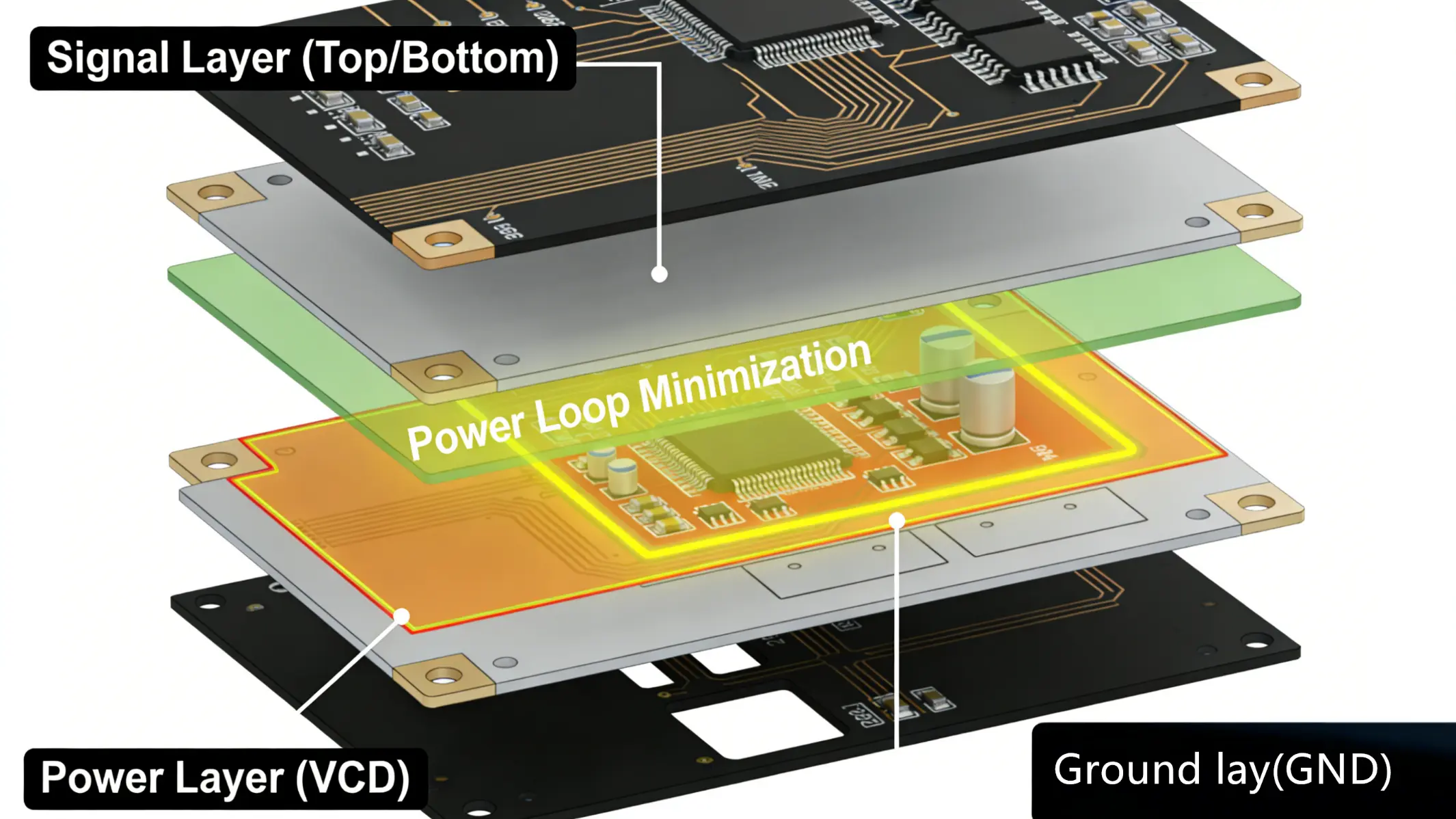 • Thermal Vias: Placed under power devices to conduct heat from the top layer to the ground plane.