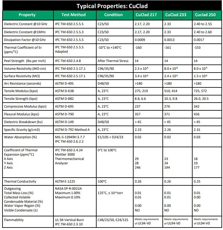 Rogers Cuclad Laminates: CuClad 217, 233, 250 Technical Data